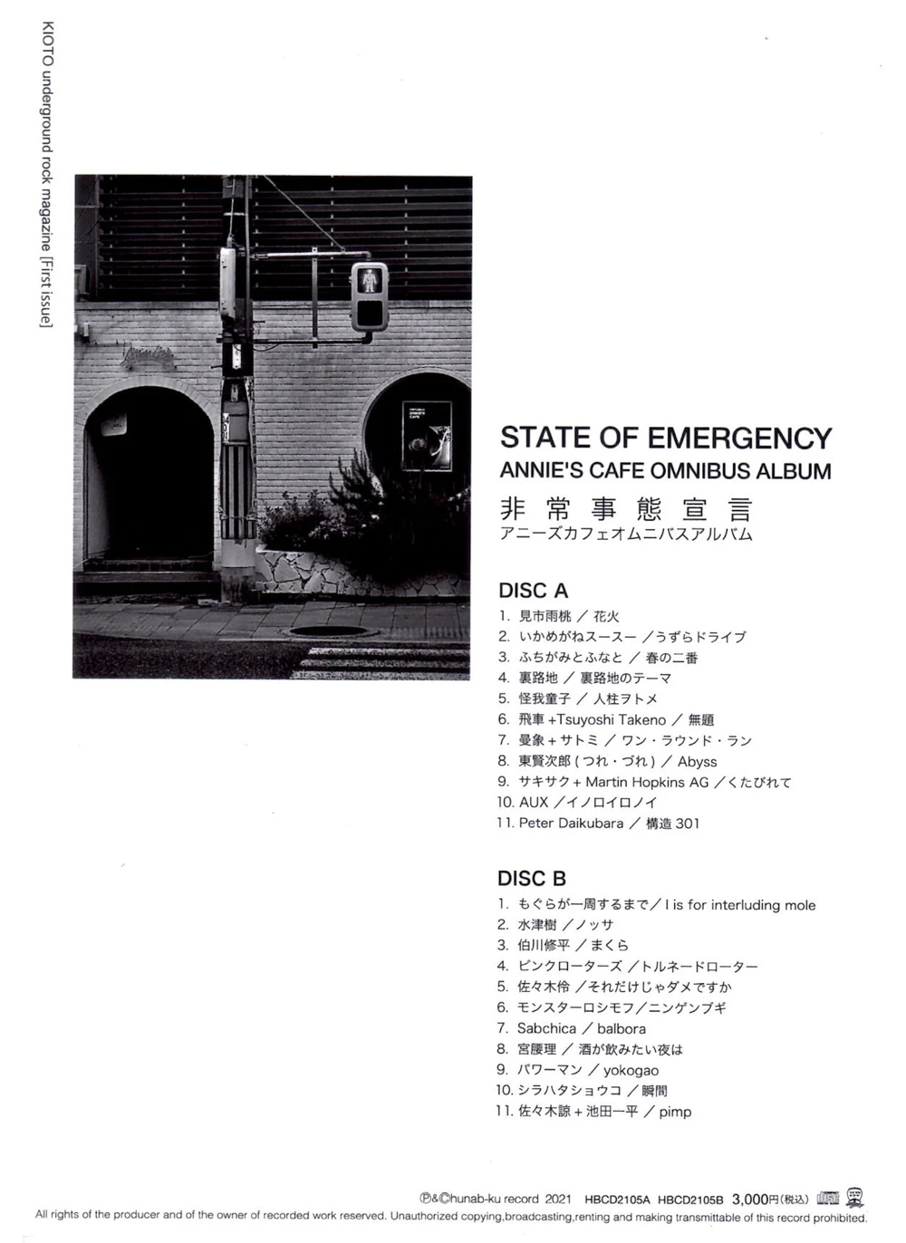 ANNIE'S CAFE OMNIBUS ALBUM『非常事態宣言』 冊子&CD / ANNIE'S CAFE / 3000円 / 2021年参加ミュージシャン(収録順): 見市雨桃、ふちがみとふなと、裏路地、怪我童子、飛車+Tsuyoshi Takeno、曼象+サトミ、東賢次郎(つれ・づれ)、サキサク+Martin Hopkins AG、AUX、Peter Daikubara