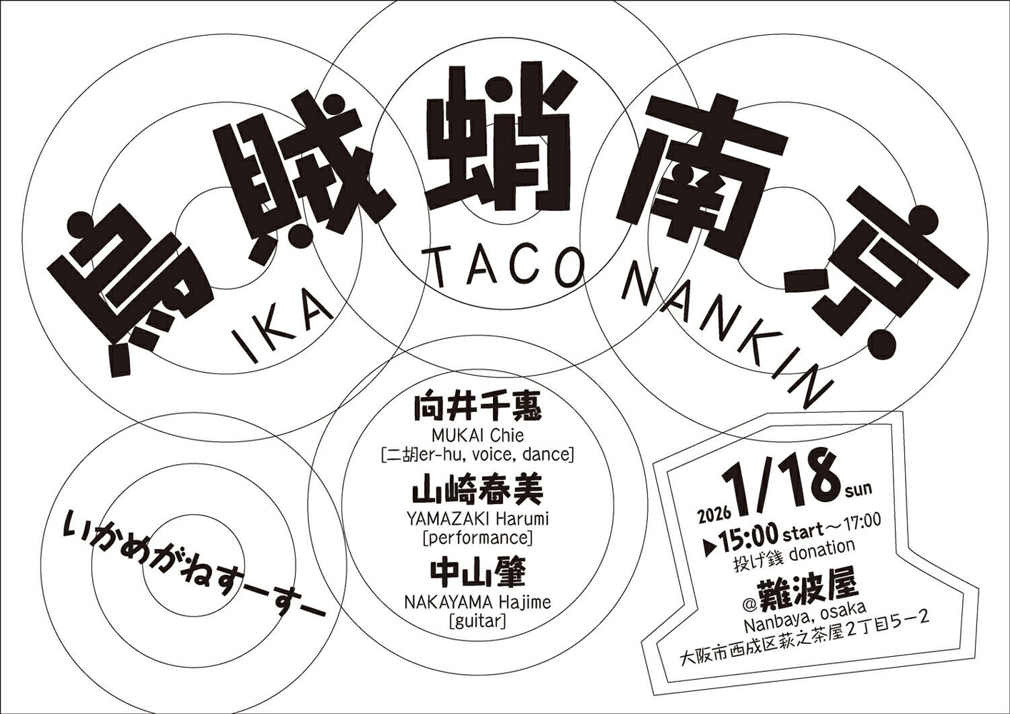 2026.1.18 (日) at 大阪 西成 難波屋 『烏賊 蛸 南京』 出演: ・向井千惠 + 山崎春美+ 中山肇 ・いかめがねすーすー 開演:15時00分 料金:投げ銭