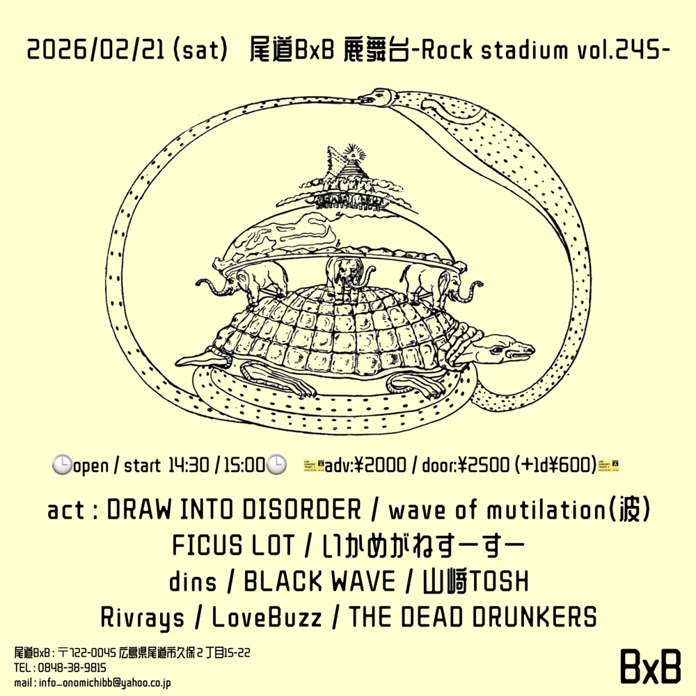 2026.2.21 (土) at 広島 尾道 BxB 『鹿舞台-rockstadium vol.245-』 出演: ・DRAW INTO DISORDER ・wave of mutilation(波) ・FICUS LOT ・dins ・BLACK WAVE ・山﨑TOSH ・Rivrays ・LoveBuzz ・THE DEAD DRUNKERS ・いかめがねすーすー 開場:14時30分/開演:15時00分 料金:前売¥2000(+1d¥600)/当日¥2500(+1d¥600)