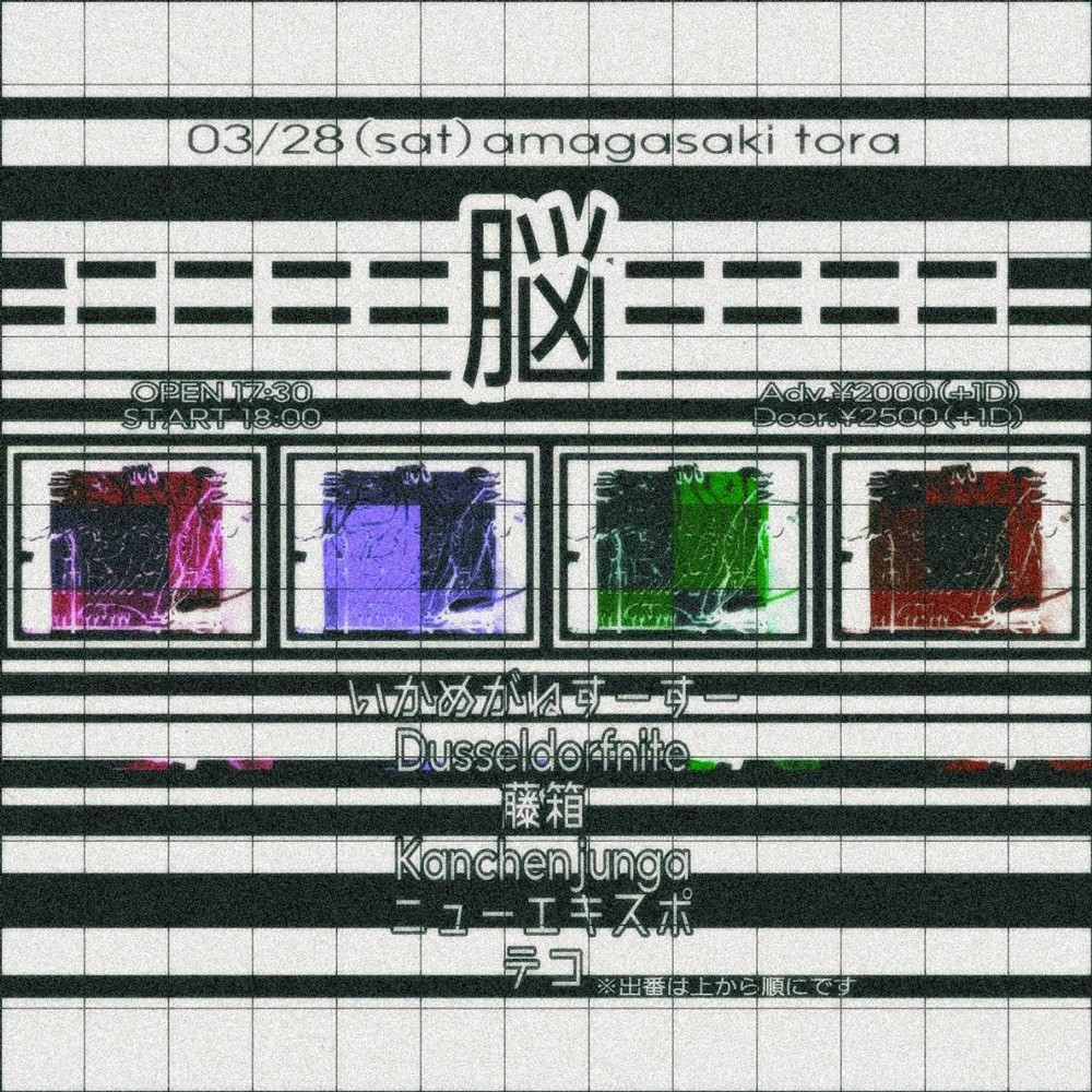 2026.3.28 (土) at 兵庫 尼崎 tora 『====脳====』 出演: ・テコ ・ニューエキスポ ・Kanchenjunga ・藤箱 ・Dusseldorfnite ・いかめがねすーすー 開場:17時30分/開演:18時00分 料金:前売¥2000(+1d)/当日¥2500(+1d)